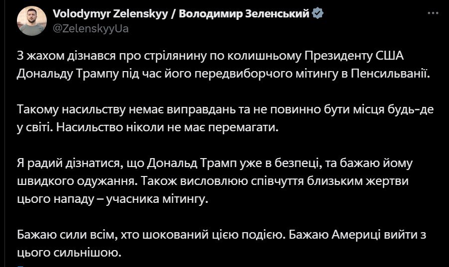 "С ужасом узнал о стрельбе по бывшему президенту США Дональду Трампу во время его предвыборного митинга в Пенсильвании. Такому насилию нет оправданий и не должно быть места где угодно в мире. Насилие никогда не должно побеждать. Я рад узнать, что Дональд Трамп уже в безопасности и желаю ему быстрого выздоровления", - заявил украинский президент.