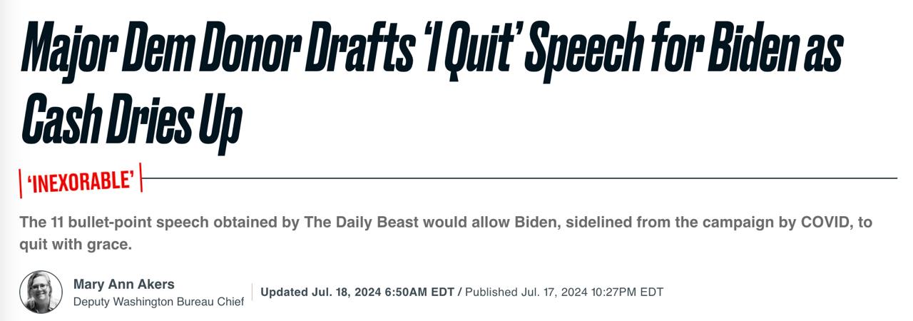 The Daily Beast даже публикует проект "победной речи", составленный одним из крупных спонсоров Демократической партии для Байдена, которая должна позволить ему "достойно покинуть гонку".