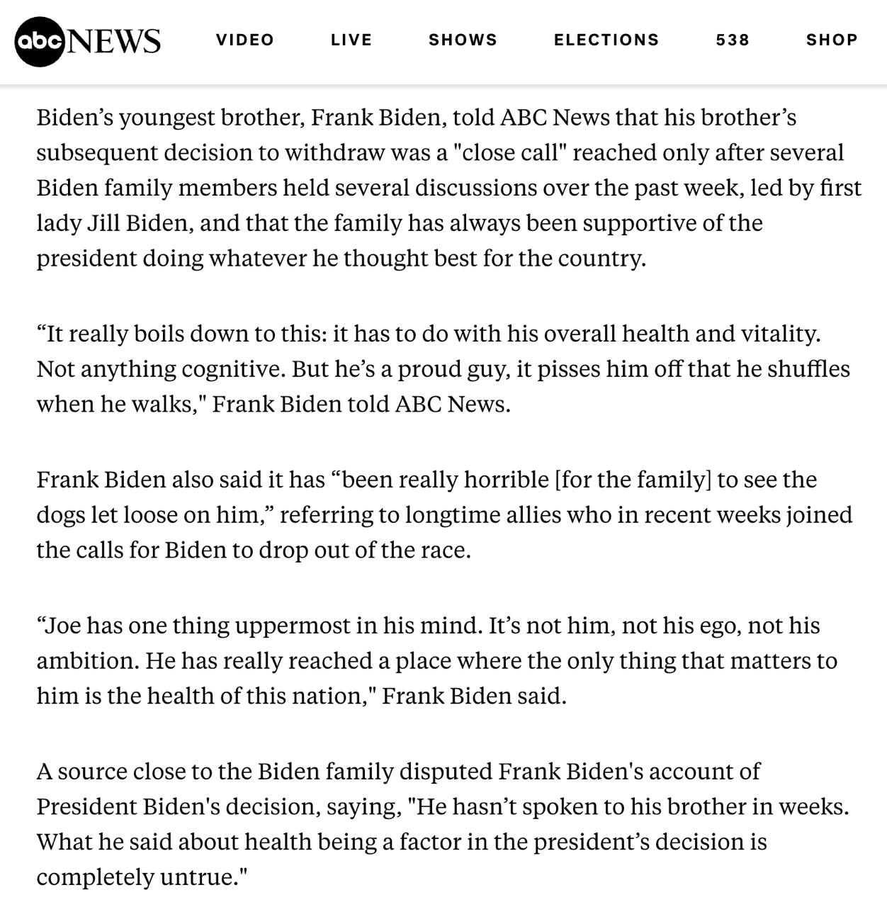 Младший брат Джо Байдена Фрэнк заявил, что решение президента США сняться с выборов было принято с учетом "общего здоровья и жизнеспособности (vitality)".