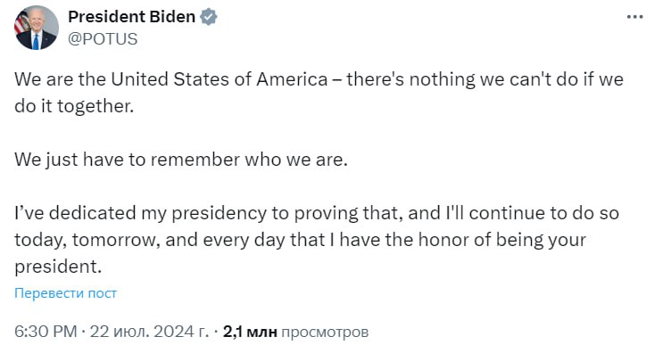 "Мы – Соединенные Штаты Америки, и нет ничего невозможного, если мы сделаем это вместе. Нам просто нужно помнить, кто мы. Я посвятил свое президентство доказательству этого и буду продолжать делать это сегодня, завтра и каждый день, когда имею честь быть вашим президентом", – написал Байден.