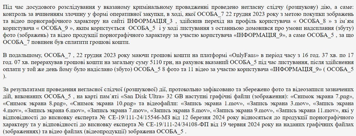 Как говорится в материалах суда, в рамках следствия в декабре 2023 года у девушки купили восемь фото и 11 видео за 5 110 гривен.