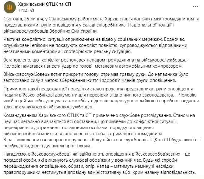 Харьковский областной ТЦК подтвердил, что на видео его сотрудники, однако добавил, что опубликованное видео не полностью показывает ситуацию: по его версии, конфликт начался нападением гражданина на военнослужащего – мужчина пытался нанести удар по голове металлическим автомобильным компрессором.