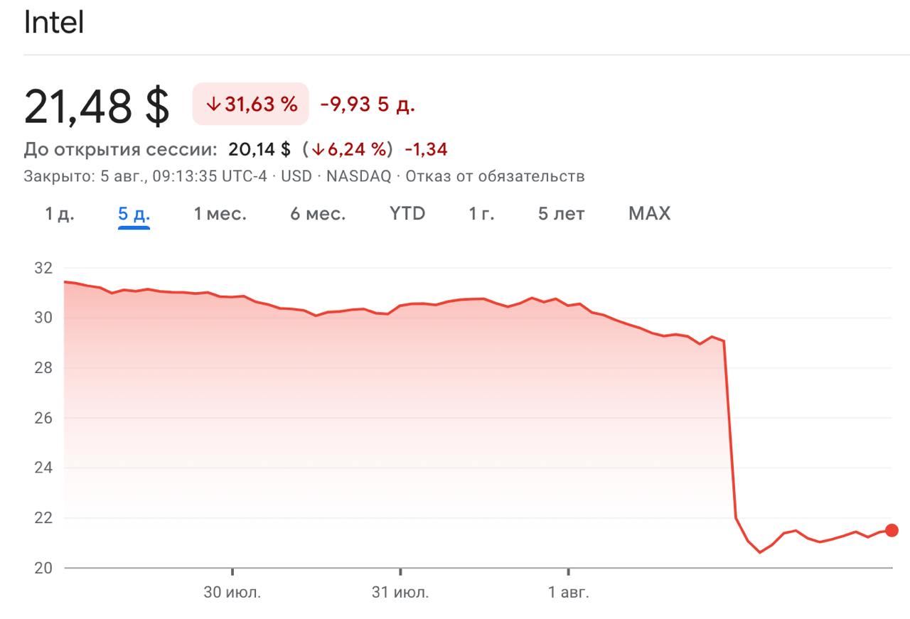 Между тем акции компании Intel на фоне падения мирового фондового рынка обрушились на 30% и продолжают падать.
