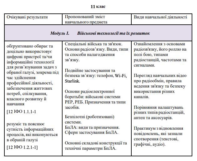 - 10 класс: содержание посвящено вопросам нацбезопасности и обороны Украины, ознакомлению с основами управления и планирования, вооружению и военной технике, стрелковой подготовке, ориентированию на местности, инженерной фортификации, медицинской помощи;