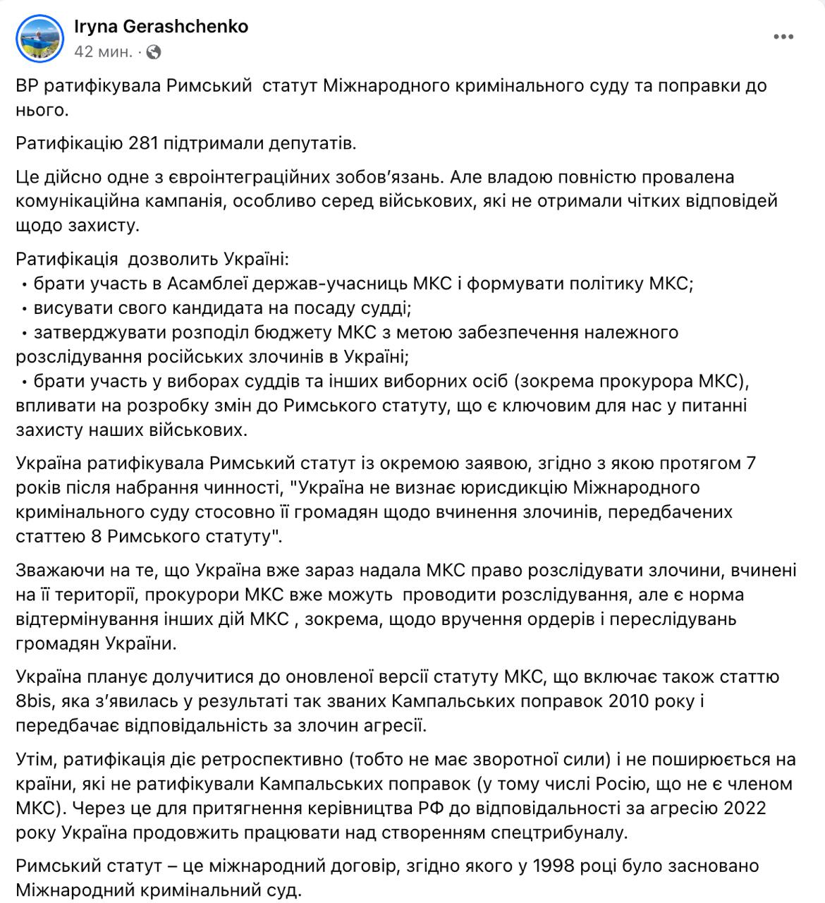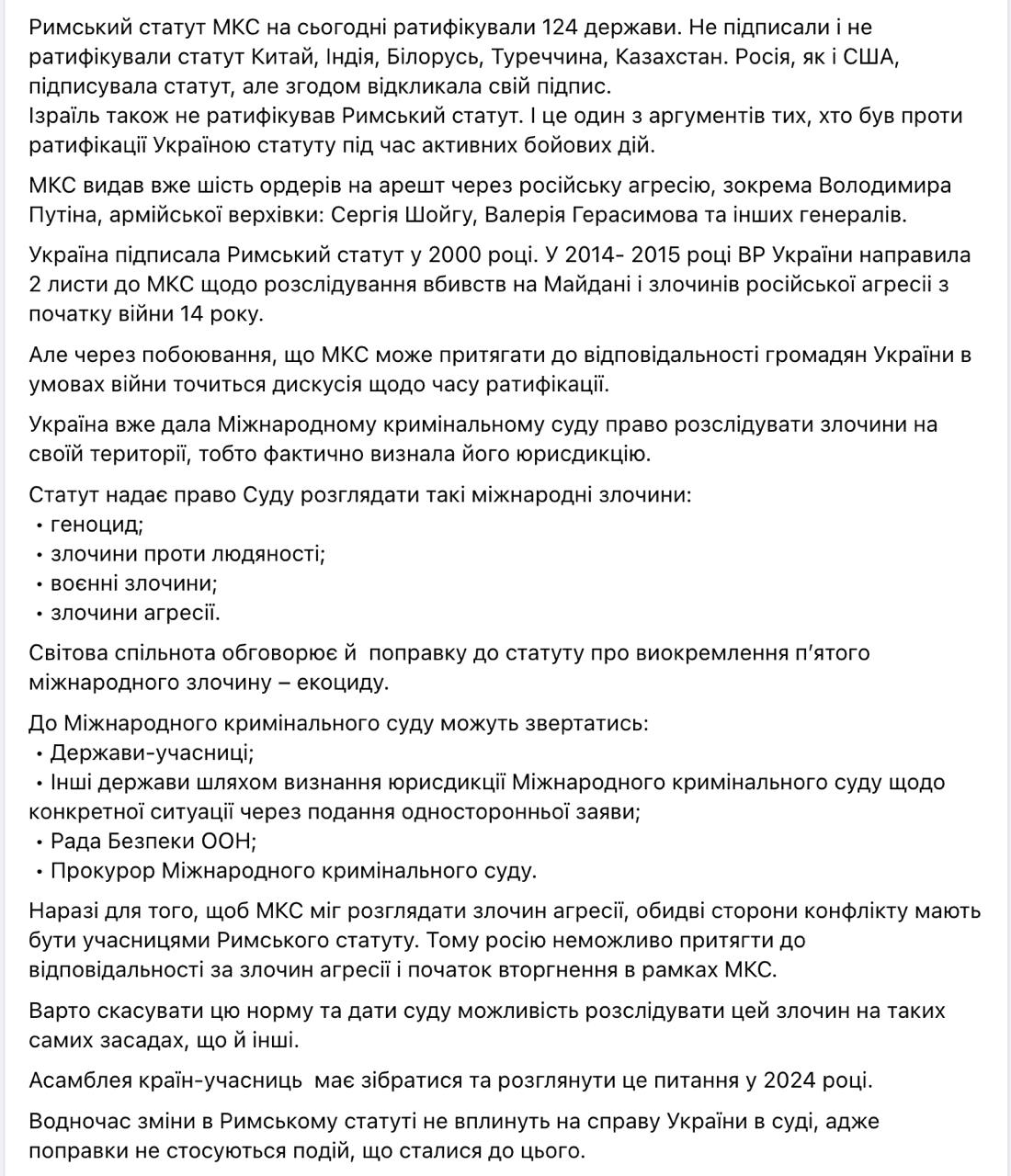 "Украина ратифицировала Римский статут с отдельным заявлением, согласно которому в течение 7 лет после вступления в силу "Украина не признает юрисдикцию Международного уголовного суда в отношении ее граждан о совершении преступлений, предусмотренных статьей 8 Римского статута" Учитывая, что Украина уже сейчас предоставила МУС право расследовать преступления, совершенные на ее территории, прокуроры МУС уже могут проводить расследование, но есть норма отсрочки других действий МУС, в частности, о вручении ордеров и преследовании граждан Украины", - сказано в публикации нардепа.