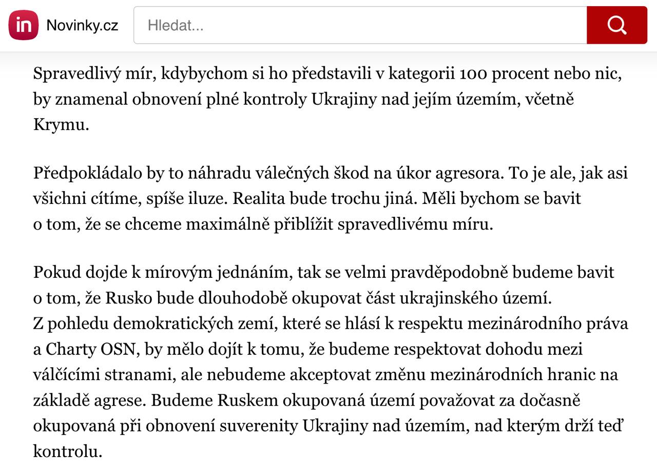 "Если мирные переговоры состоятся, то, скорее всего, мы еще долго будем говорить об оккупации Россией части украинской территории. С точки зрения демократических стран, которые заявляют о соблюдении международного права и Устава ООН, должно случиться так, что мы будем соблюдать соглашение между воюющими сторонами, но не примем изменение международных границ на основе агрессии. Мы будем считать территории, оккупированные Россией, временно оккупированными в ходе восстановления суверенитета Украины над территорией, которую она сейчас контролирует", - добавил Павел.