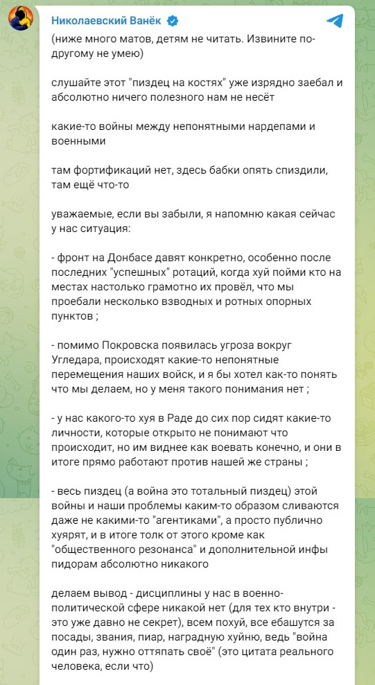 Об этом с обилием нецензурной лексики написал известный украинский военный телеграм-канал "Николаевский Ванек".