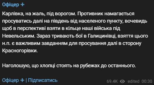 Ранее о том, что Карловка захвачена писали российские паблики. А украинские военные подтверждали, что ВСУ в Карловке оказались под угрозой окружения.