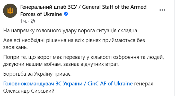 "По направлению главного удара врага ситуация сложная. Но все необходимые решения на всех уровнях принимаются без промедления. Несмотря на то что враг имеет преимущество в количестве вооружения и людей, благодаря нашим воинам, несет ощутимые потери", - заявил Сырский.