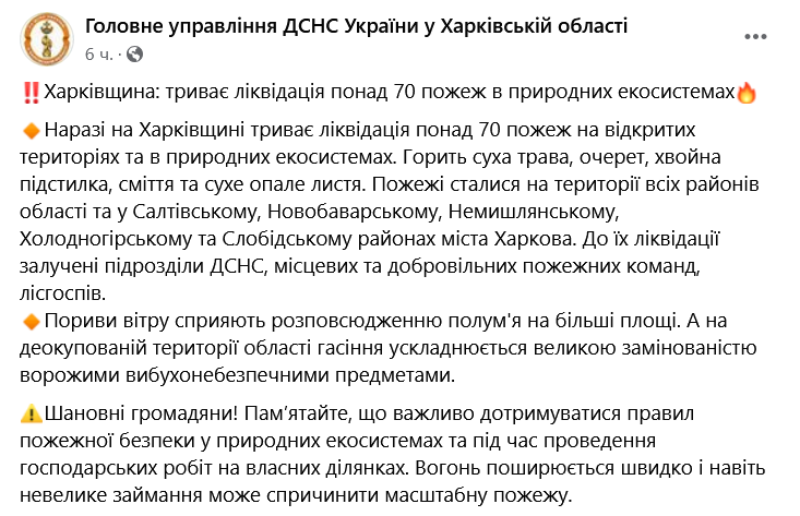 Отмечается, что пожары произошли на территории всех районов области и в Салтовском, Новобаварском, Немышлянском, Холодногорском и Слободском районах Харькова. К их ликвидации привлечены подразделения ГСЧС, местных и добровольных пожарных команд, лесхозов. Распространению пламени на большие площади способствуют сильные порывы ветра. А на деоккупированной территории области тушение усложняется большой заминированностью взрывоопасными предметами.