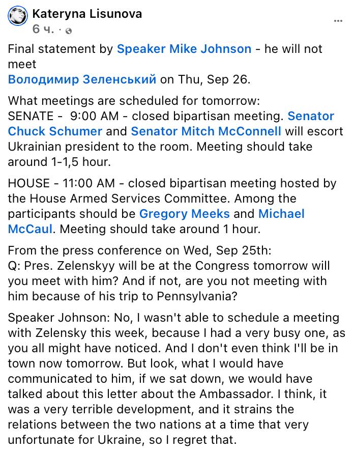 Спикер Палаты представителей Майк Джонсон отказался встречаться с украинским президентом, который находится в США, передает журналист "Голоса Америки".