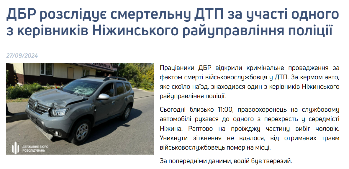 В Нежине один из руководителей местного райуправления полиции на служебном авто сбил насмерть военного. Об этом сообщает Государственное бюро расследований.