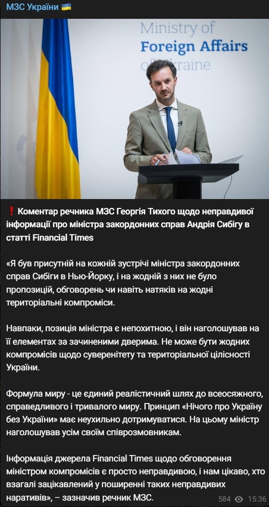 В то же время МИД отрицает информацию Financial Times, что Сибига в США обсуждал возможность прекращения войны по линии фронта.