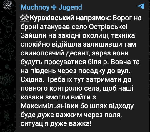 Украинский же военный с позывным "Мучной" пишет, что россияне высадили десант уже на западной окраине Островского. Он видит в этом угрозу окружения соседней Максимильяновки, которую также штурмует РФ.