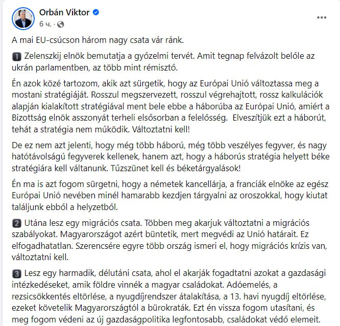 «Президент Зеленский представляет свой план победы. То, что он изложил вчера в украинском парламенте, более чем устрашающе… Нам нужно перейти от военной стратегии к мирной стратегии. Нам нужно прекращение огня и мирные переговоры», – заявил Орбан.