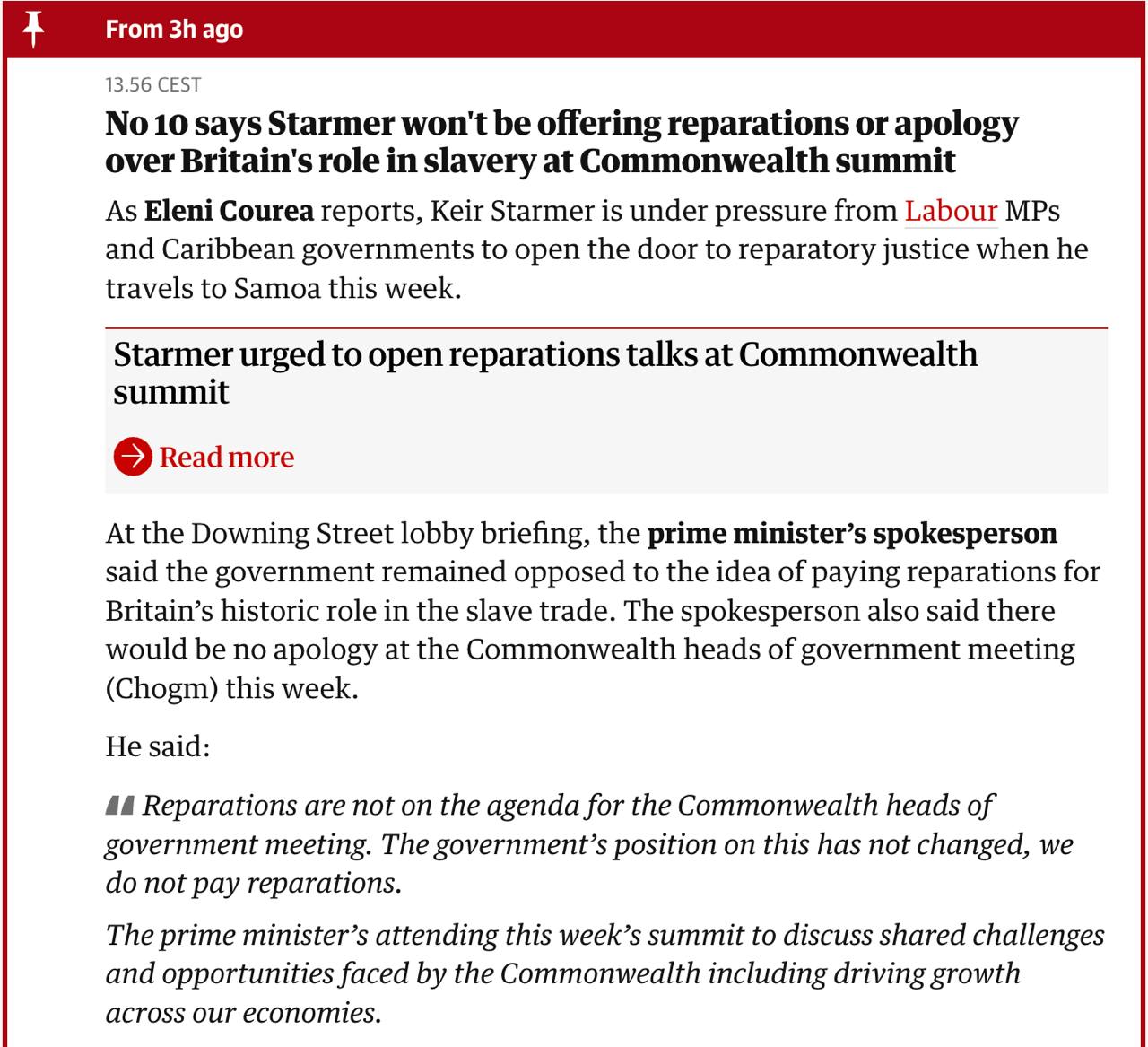 Как пишет газета The Guardian, об этом заявил представитель премьер-министра Соединенного Королевства Кира Стармера накануне его визита на саммит Содружества в Самоа, который проходит сегодня.