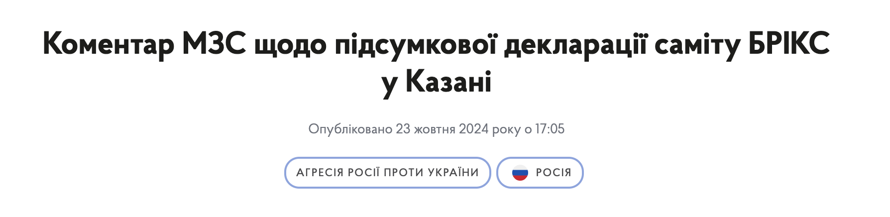 "Считаем, что этот текст фактически свидетельствует, что России не удалось "экспортировать" участникам саммита БРИКС свои неоимпериалистические взгляды на смену мирового правопорядка и глобальной архитектуры безопасности через агрессию против Украины. Попытки Москвы навязать представления о якобы альтернативной позиции так называемого глобального Юга потерпели очередное фиаско". Декларация продемонстрировала, что БРИКС не имеет единой позиции относительно российской агрессии против Украины", - говорится в заявлении украинского МИД.