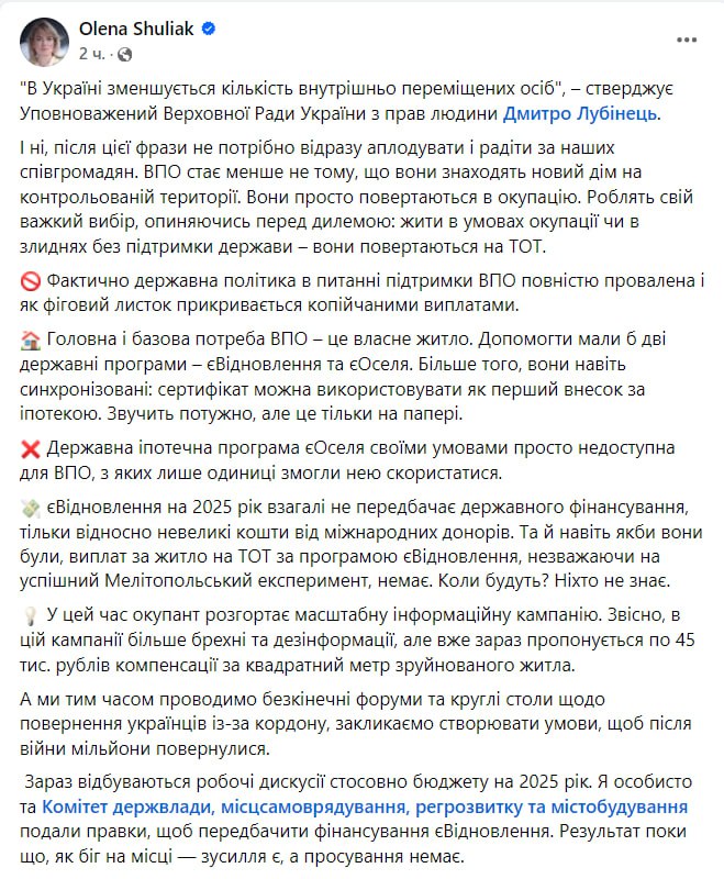 Так председатель партии "Слуга народа" Елена Шуляк прокомментировала заявление омбудсмена Дмитрия Лубинца о том, что ВПЛ возвращаются на захваченные территории.