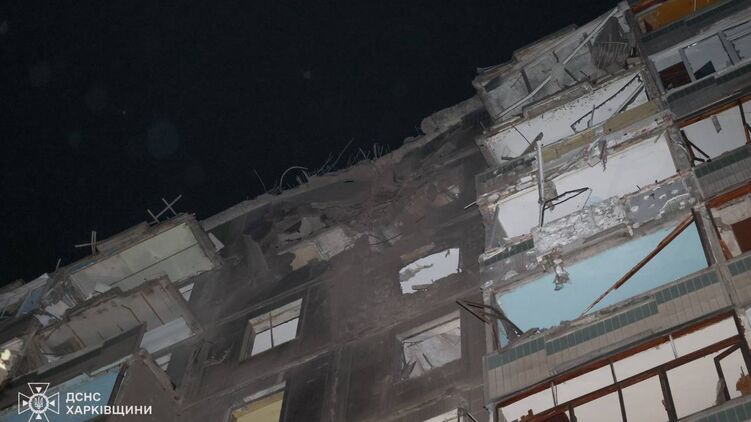 В Холодногорском районе в результате авиационного удара частично разрушены квартиры на верхнем этаже девятиэтажного жилого дома. Также в здании выбиты окна.