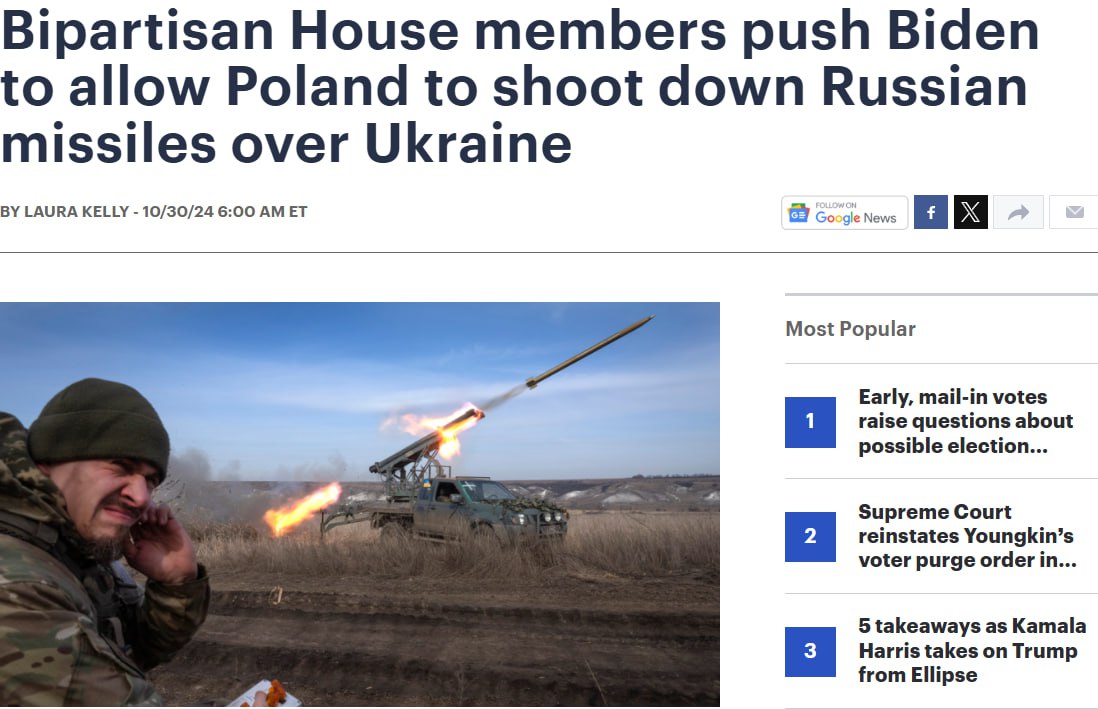 Издание сообщает, что лидеры Хельсинкской комиссии Конгресса США от обеих партий призывают президента Байдена разрешить союзнику по НАТО Польше распространить свою противовоздушную оборону на небо Украины, помогая сбивать российские ракеты под предлогом самообороны.
