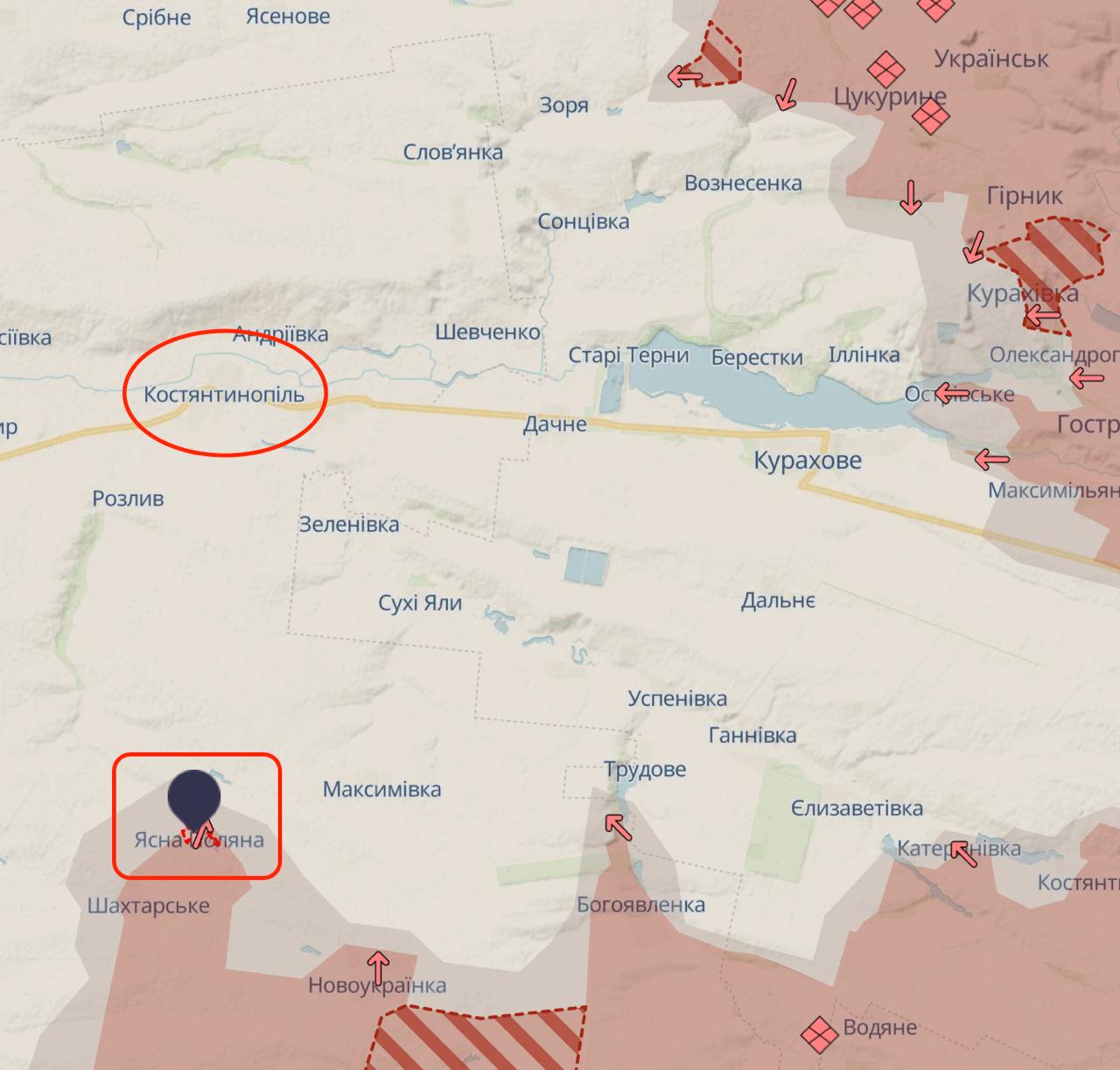 Карта Deep State не показывает новых продвижений в поселке, но он полностью указан под контролем РФ или в серой зоне. Российские карты показывают контроль РФ над Ясной Поляной, а также продвижение российских войск на север, к юго-востоку и к юго-западу от нее.