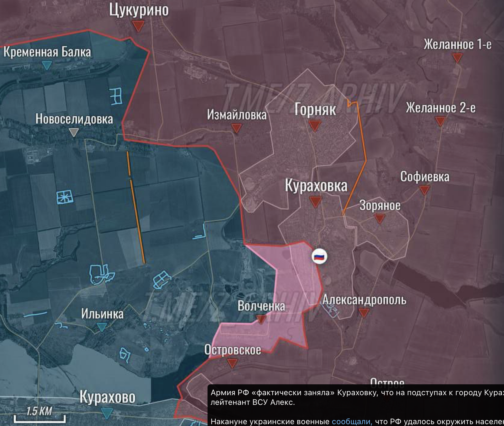 Россияне же в своих картах утверждают, что захватили уже полностью и Кураховку, и соседние Волченку и Александрополь. Что означает срезание всего "кармана" к северо-востоку от Курахово.