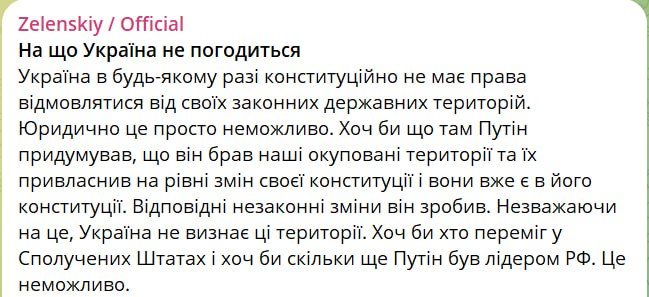 "Юридически это просто невозможно. Что бы там Путин ни придумывал, что он брал наши оккупированные территории и их присвоил на уровне изменений своей конституции, и они уже есть в его конституции. Соответствующие незаконные изменения он произвел. Несмотря на это, Украина не признает эти территории. Кто бы ни победил в Соединенных Штатах, и сколько бы еще Путин ни был лидером РФ, это невозможно", – сказал украинский президент.