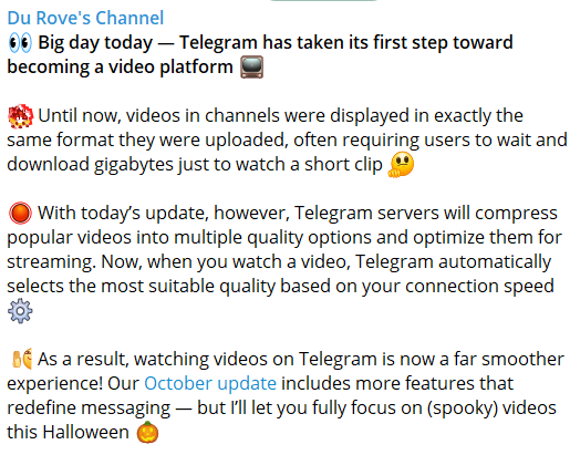 "До сих пор видео в каналах отображались в том же формате, в котором они были загружены, и пользователям часто приходилось ждать и скачивать гигабайты, чтобы посмотреть короткий ролик. Однако с сегодняшним обновлением серверы Телеграма будут сжимать популярные видео в несколько вариантов качества и оптимизировать их для потоковой передачи. Теперь, когда вы смотрите видео, Телеграм автоматически выбирает наиболее подходящее качество в зависимости от скорости вашего соединения", – сообщил основатель мессенджера, который сделал очередной шаг на пути к видеоплатформе.