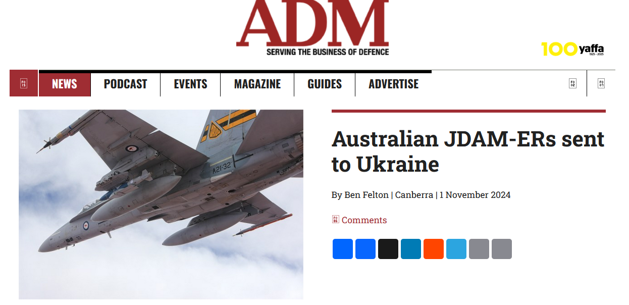 Из плана министерства обороны по управляемому вооружению и взрывоопасным боеприпасам, обнародованном 30 октября, стало известно, что Австралия изъяла из эксплуатации боеприпасы Mk.82 500lb JDAM-ER собственного производства, однако неизвестно, когда именно боеприпасы были переданы Украине.