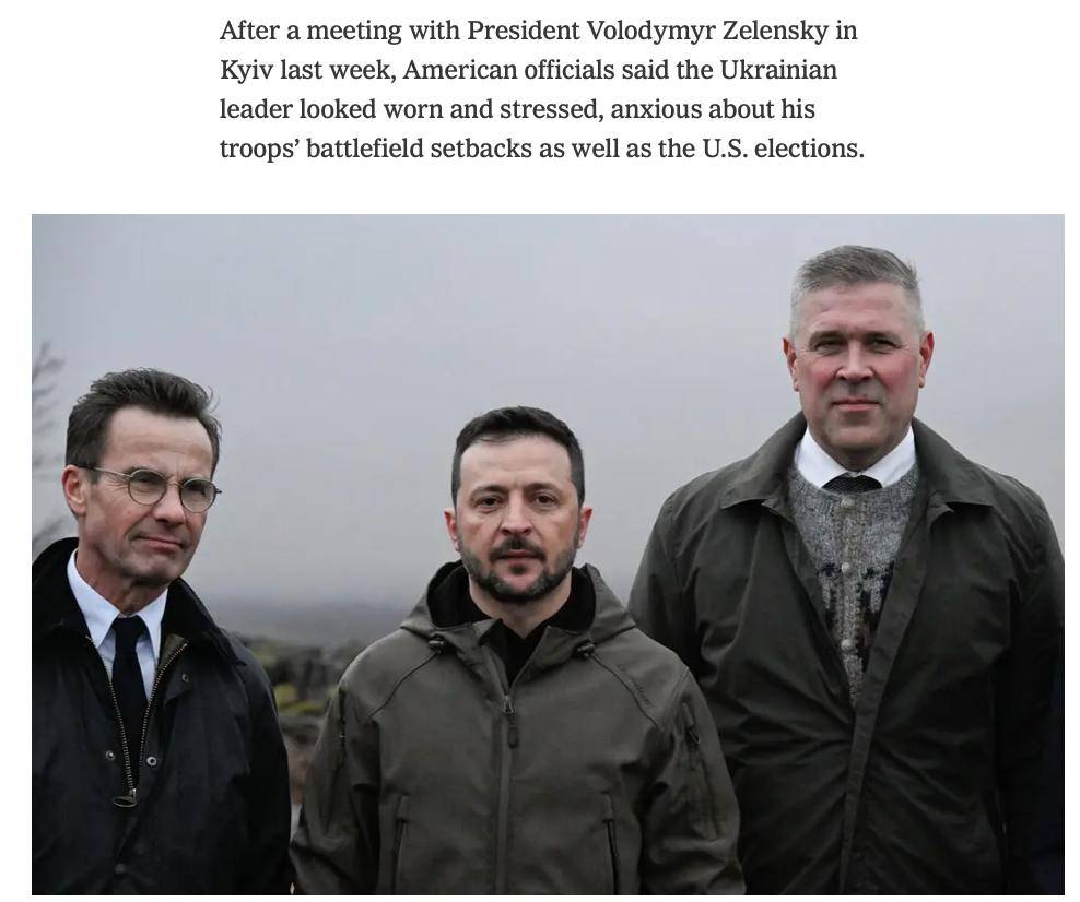 «После встречи с президентом Владимиром Зеленским в Киеве на прошлой неделе американские чиновники заявили, что украинский лидер выглядел измотанным и напряженным, обеспокоенным неудачами своих войск на поле боя, а также в отношении выборов в США», - говорится в статье.