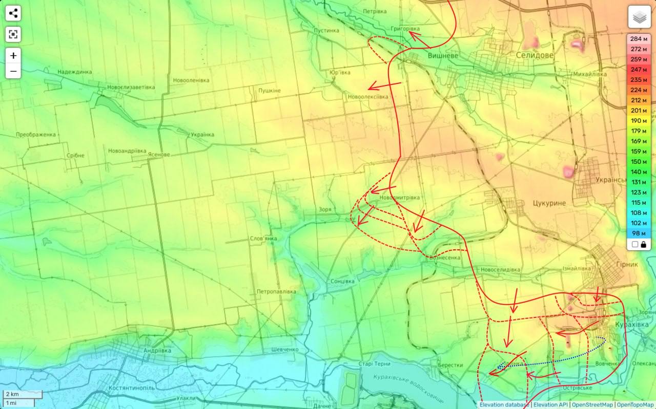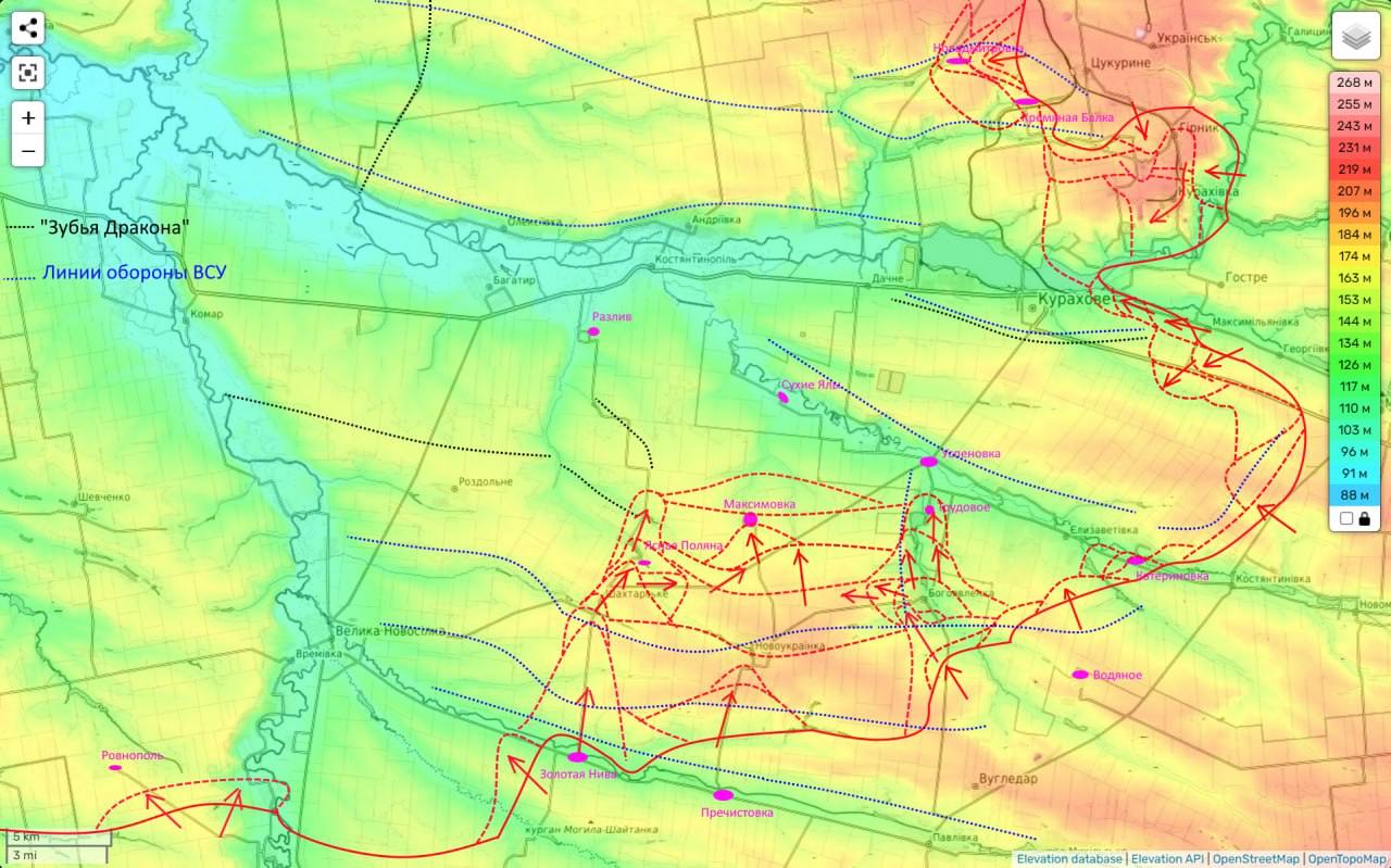 К северу от Курахово DS подтверждает продвижение РФ в сторону Вознесенки. Украинские же военные пишут, что "почти потеряно" село Ильинка.