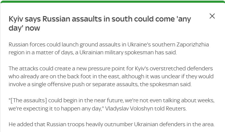 В свою очередь спикер Сил обороны юга Владислав Волошин заявил, что россияне могут начать штурмы в Запорожской области в течение нескольких дней, сообщает Sky News.