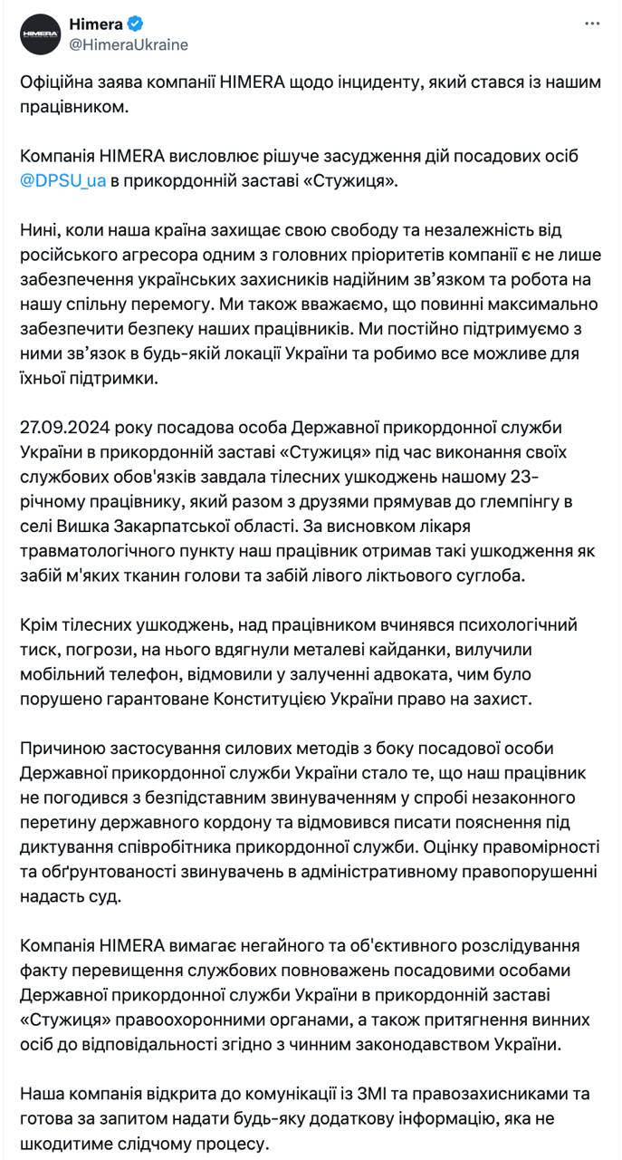 Инцидент произошел на пограничной заставе "Стужица" еще 27 сентября. Молодой сотрудник фирмы и его друзья направлялись к глэмпингу (кемпинг в отельных условиях) в селе Вышка Закарпатской области и встретили пограничников. Те обвинили мужчину в попытке незаконного пересечения границы. Сотрудник отверг эти обвинения и "отказался писать объяснения под диктовку" пограничников. В ответ на него надели наручники, забрали у него телефон, отказали ему в вызове адвоката и нанесли повреждения: ушиб мягких тканей головы и ушиб левого локтевого сустава, что подтверждено заключением врача.
