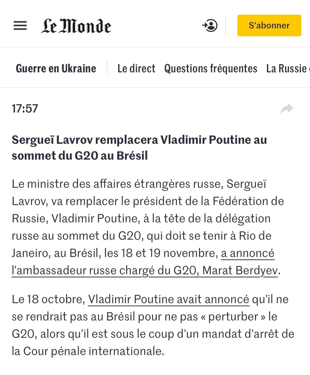 Глава МИД РФ возглавит российскую делегацию на саммите G20, который состоится 18-19 ноября в Рио-де-Жанейро. Издание пишет, что Путин отказался ехать на мероприятие из-за ордера на арест от Международного уголовного суда. Бразильские власти не предоставили четких гарантий, что президента РФ не задержат на основании ордера МУС.