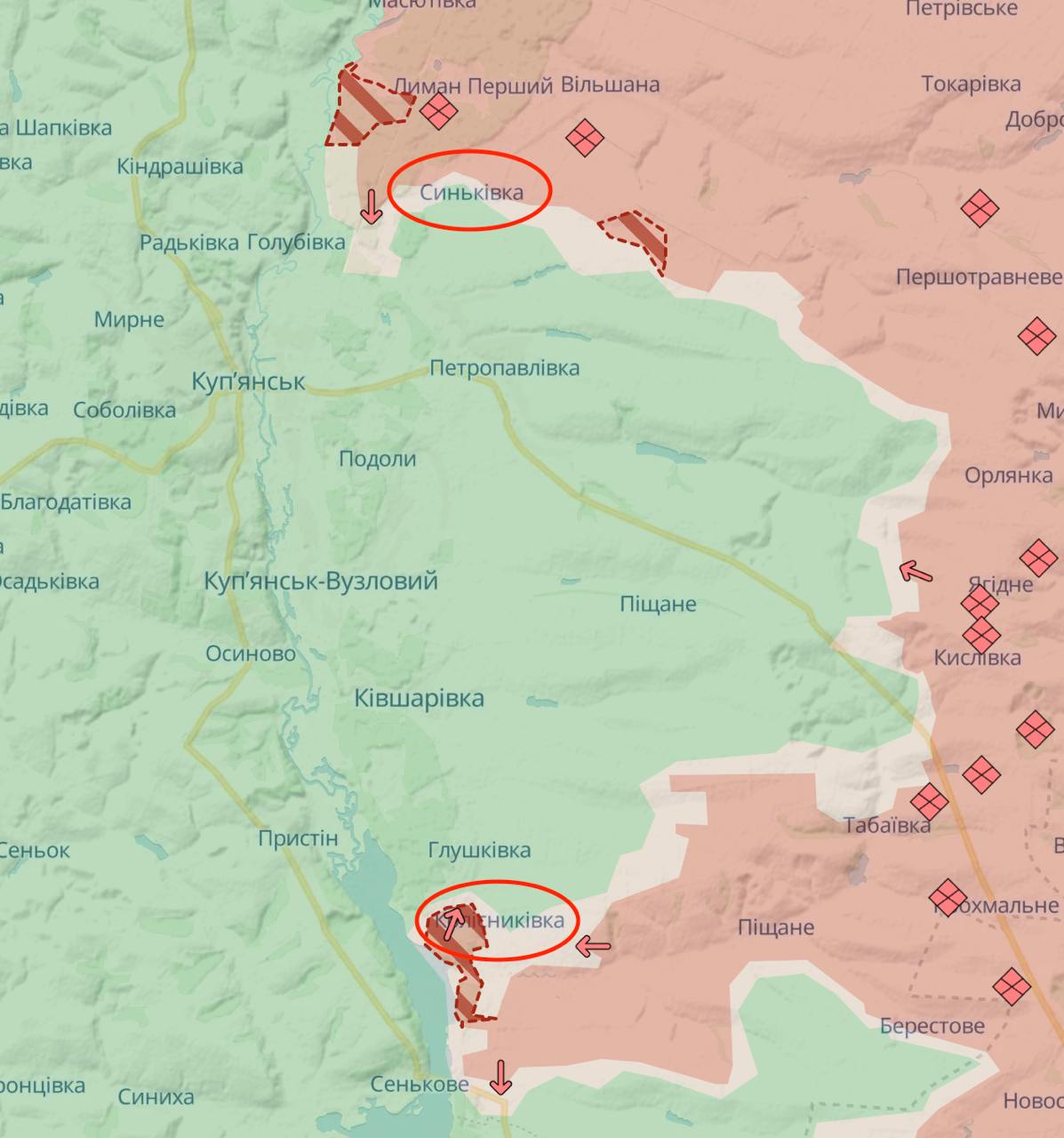 С юга удалось продвинуться на 3,5 км в сторону города вдоль реки Оскол, почти захвачена Колесниковка - она вся находится в серой зоне или под контролем РФ. С севера продвижение в двух местах по флангам Синьковки. Видимо, россияне попытаются обойти ее с двух сторон.