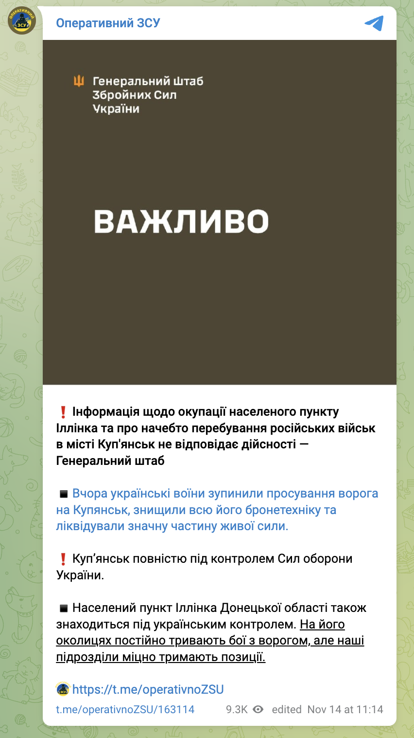 При этом глава Купянской администрации утром 14 ноября заявил, что российский десант, внезапно ворвавшийся в город, уже уничтожили.