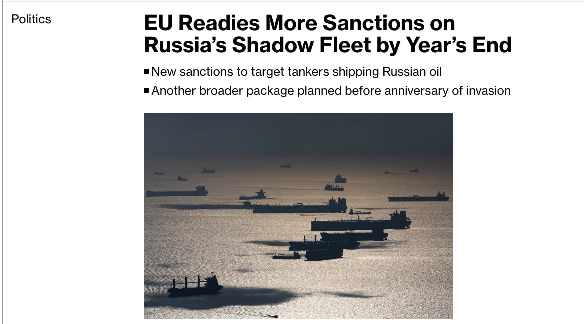 Агентство сообщает, что о планах Евросоюза "атаковать" "теневой флот" РФ, с помощью которого она экспортирует свою нефть, рассказали неназванные источники. По их словам, следующий пакет также будет включать санкции против отдельных лиц, участвующих в торговле. Обсуждение ограничений, входящих в новый пакет, продолжается.