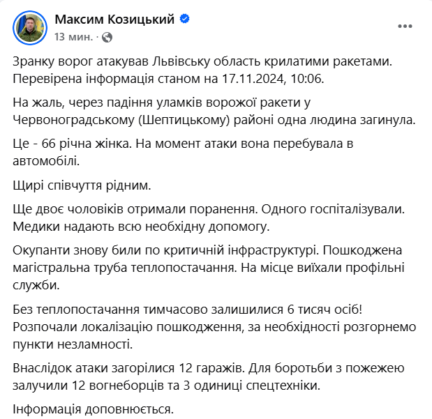 Во Львовской области россияне ударили по критической инфраструктуре, сообщил глава ОВА Максим Козицкий.