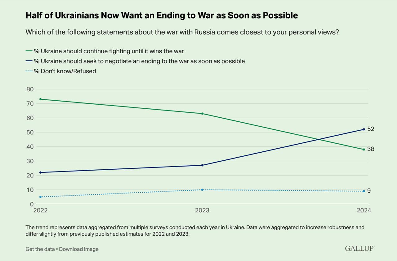 Согласно опросу американской компании Gallup, проведенному в августе и октябре 2024 года, в среднем 52% украинцев хотели бы, чтобы Украина вела переговоры о прекращении войны как можно скорее.
