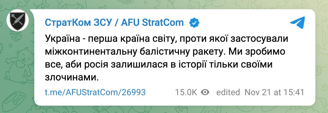 16:34 Стратком ВСУ тоже заявляет, что по Украине ударили межконтинентальной баллистической ракетой.