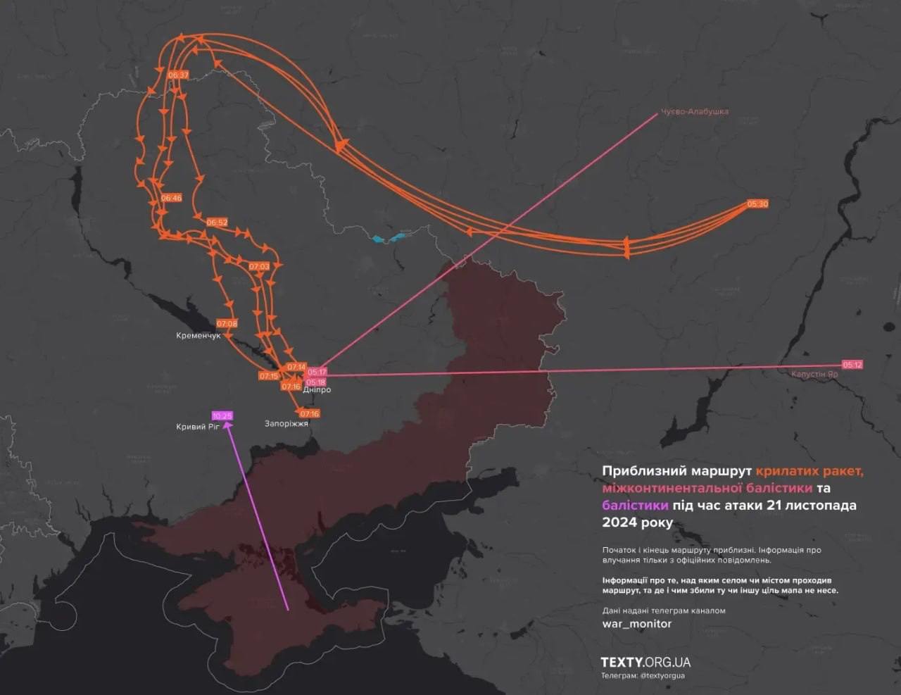 18:25 Маршруты крылатых и баллистических ракет, которые РФ запустила сегодня по Украине, публикуют мониторинговые паблики.