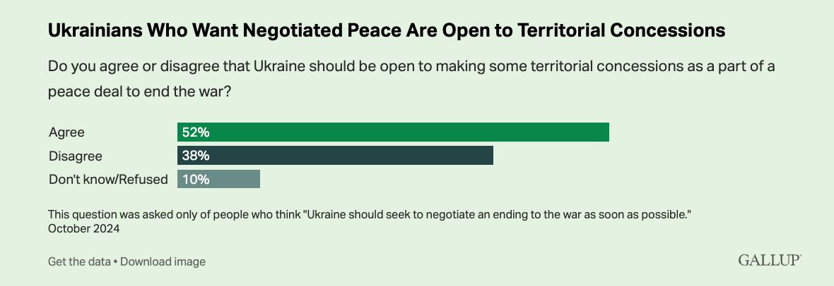 Сторонников территориальных уступок ради окончания войны в Украине 52%. Тех, кто против этого, - 38% и еще десять процентов не определились.