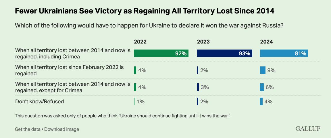 В 2022 и 2023 годах подавляющее большинство в этой группе (92% и 93% соответственно) считало, что победа означает возвращение всей территории, потерянной с 2014 года, включая Крым. В 2024 году этот показатель снизился до 81%.