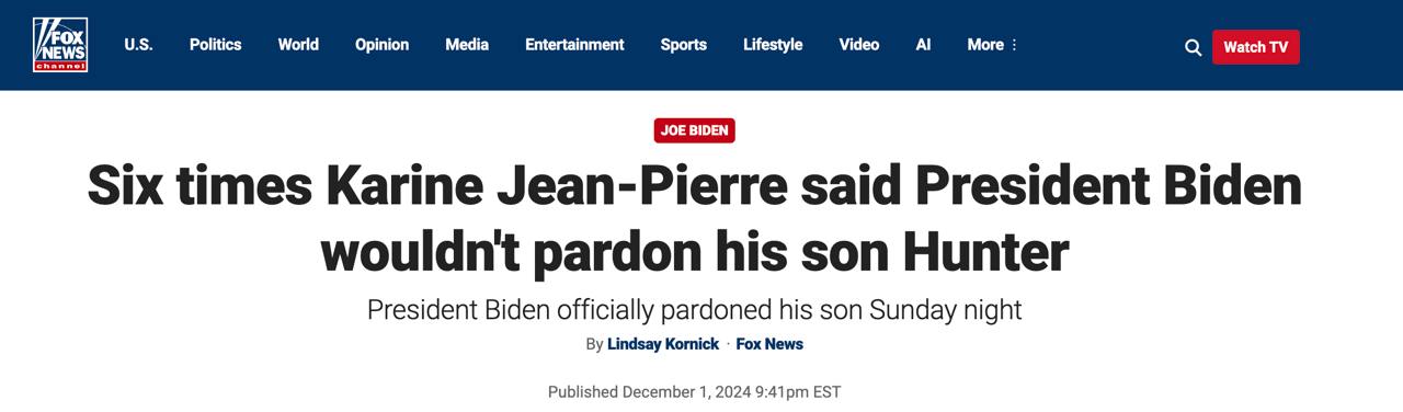 За последние полтора года пресс-секретарь Белого дома шесть раз заявляла, что президент Джо Байден не помилует своего сына Хантера, однако в итоге именно это он сегодня и сделал.