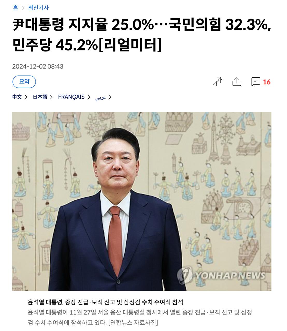 17.50 Накануне сегодняшних событий в Сеуле агентство "Рёнхап" опубликовало свежий соцопрос, который показал рейтинг президента Юн Сок Ёля на уровне 25%. При этом негативная оценка действий президента составила 71,0%.
