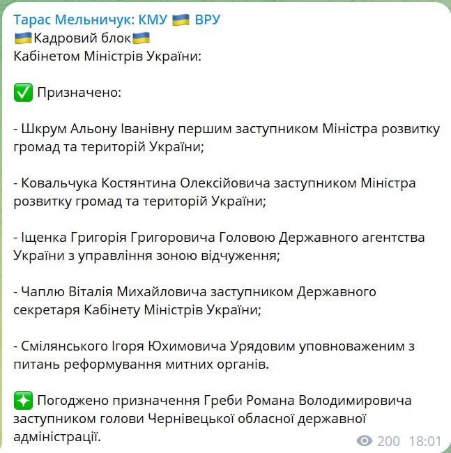 Об этом в своем телеграм-канале сообщил представитель Кабинета министров в Верховной Раде Тарас Мельничук.
