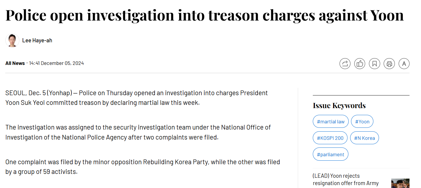 Полиция Южной Кореи начала расследование в отношении президента Юн Сок Ёля по делу о государственной измене.