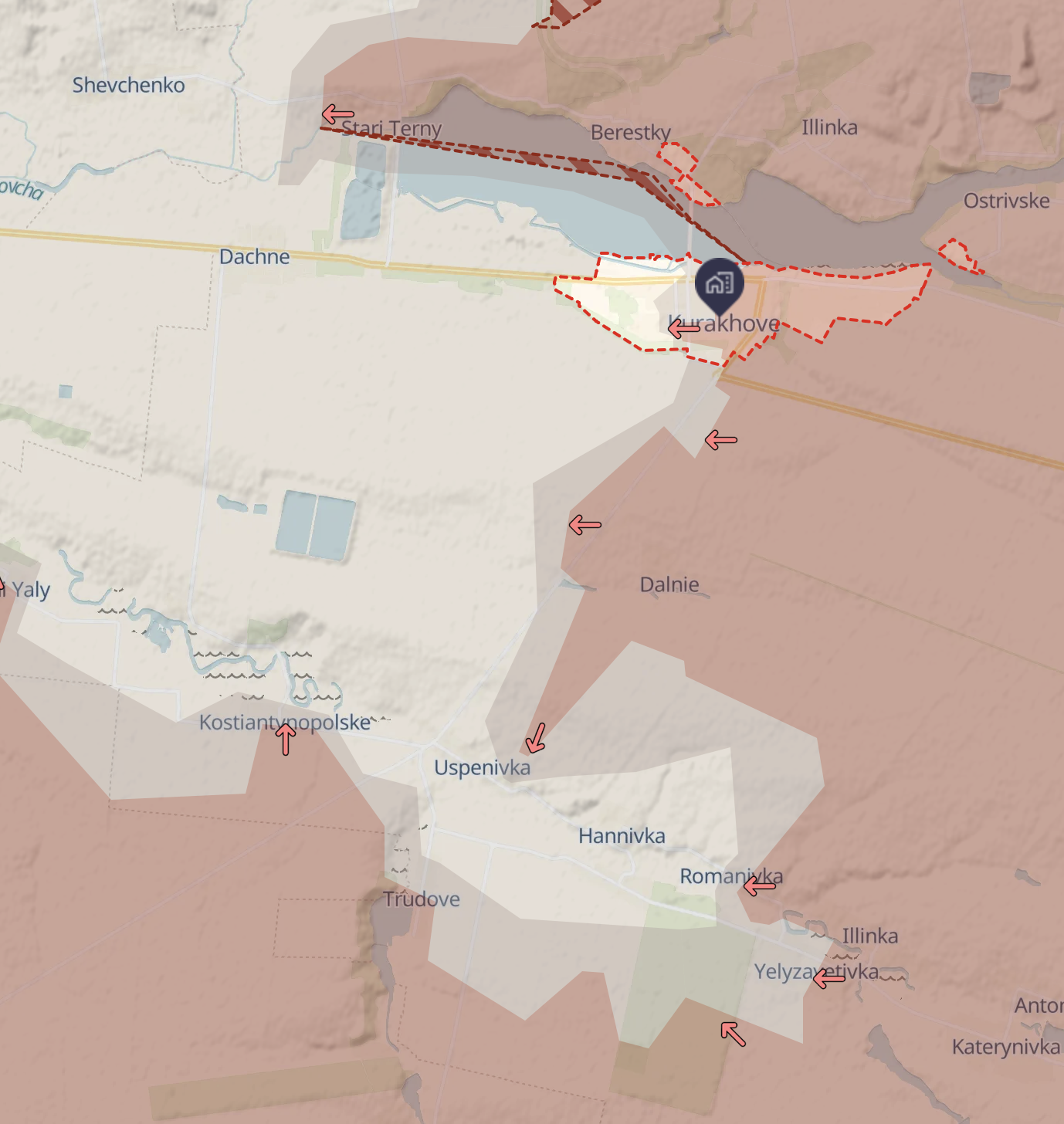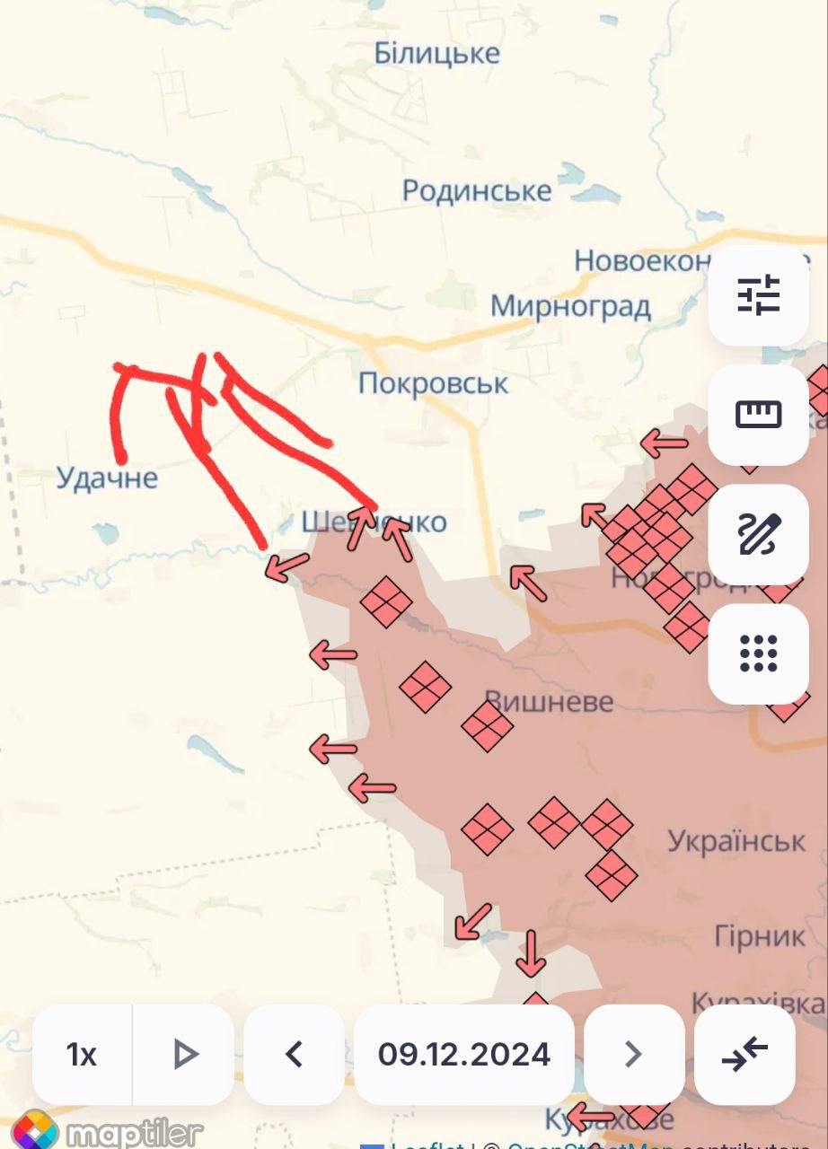 "Алекс" также пишет, что захват Шевченко создает угрозу охвата Покровска с запада и выхода РФ на трассу на Павлоград. Он отмечает, что с учетом рельефа дальнейшее движение РФ возможно севернее или северо-западнее Шевченко.