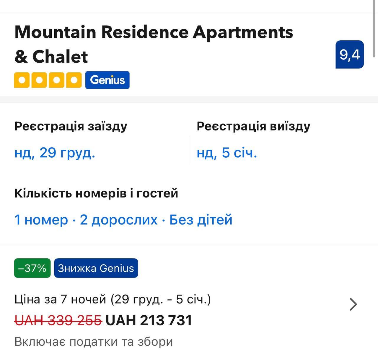 Проживание в гостинице Mountain Residence Apartments & Chalet в апартаментах с одной спальней стоит 339 255 гривен без скидки и 213 731 гривну со скидкой.
