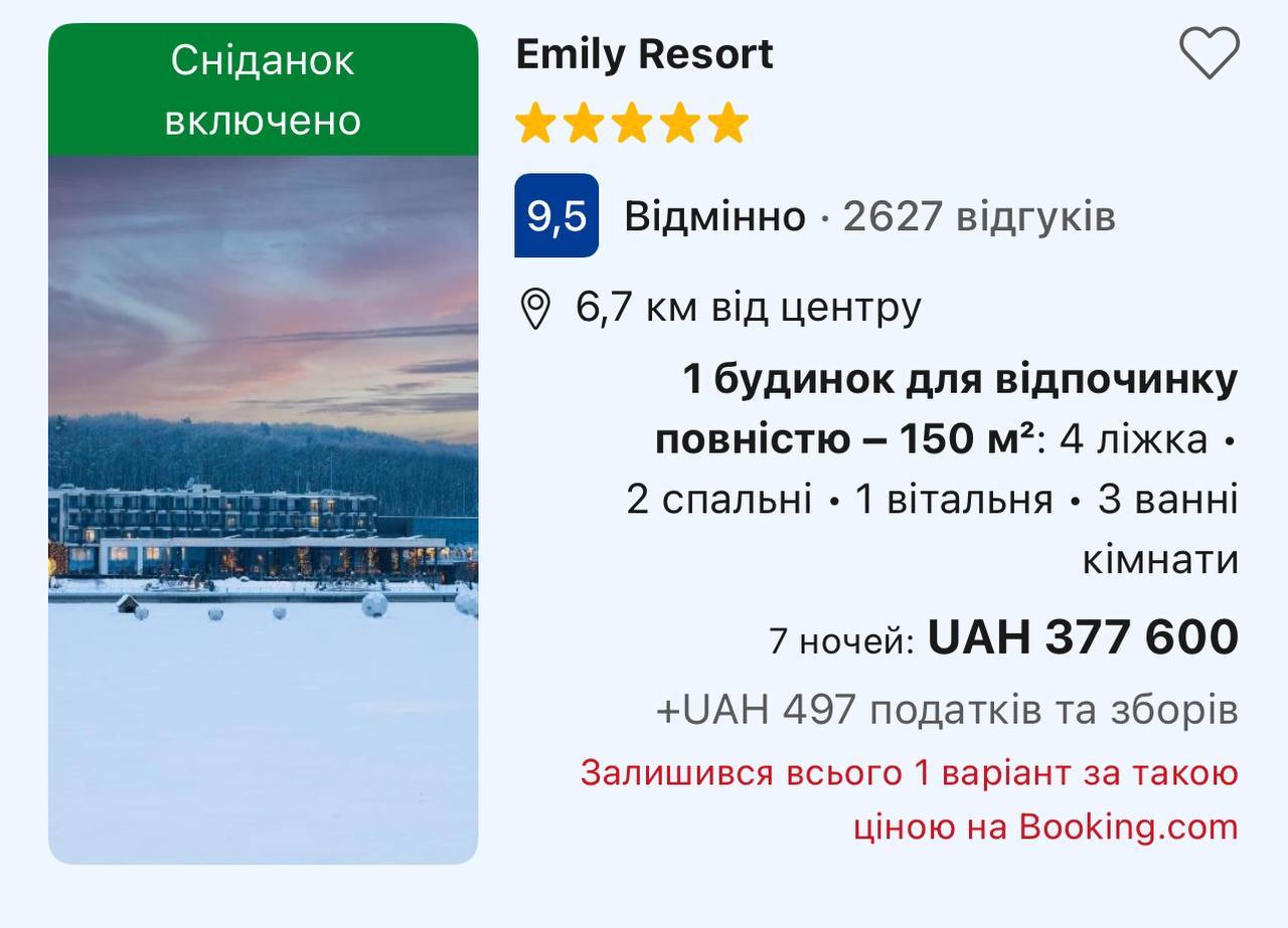 Кроме Буковеля, среди туристов также популярен курорт Emily Resort во Львовской области, где стоимость отдыха за 7 ночей составляет 377 600 гривен. Несмотря на высокие цены, свободных номеров на празднование Нового года в Emily Resort уже нет.